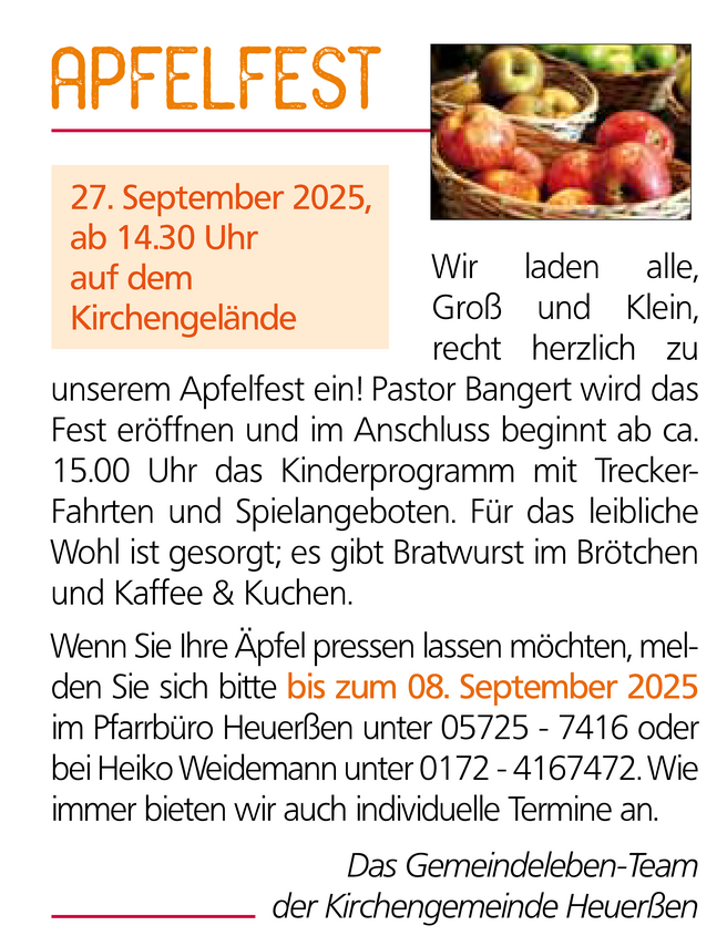 Herzlich wird eingeladen zum Apfel-Fest am 27. September ab 14.30 Uhr auf dem Kirchengelände.